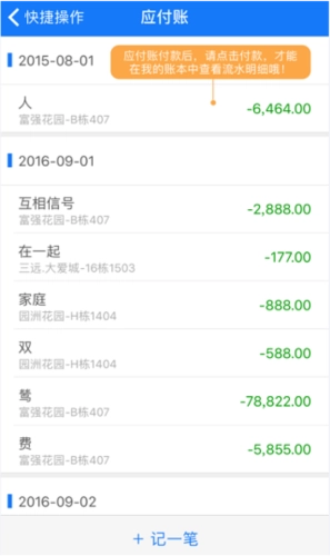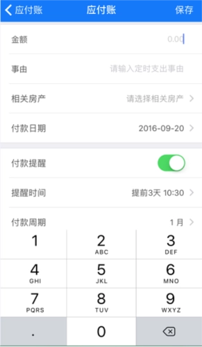 点击“记一笔”,填写各项数据后点击“保存”;此外,应付账款支持设置提醒功能与缴费周期。