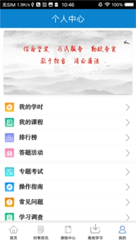 5、学时查询方面,每门课程完成学习后,学院会自动登记该课程的学时,个人详细学时可在学院内进行查询。登录系统后,点击导航栏中的“个人中心”,即可进入个人信息页面。