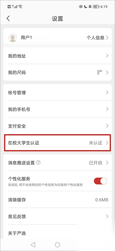 2. 当进入设置页面,寻找到“在校大学生认证”选项,然后点击它。