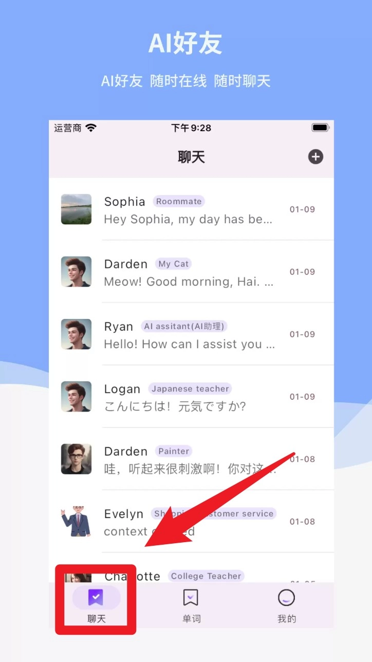 2. 登录成功后默认进入“聊天”界面,选择任意 AI 好友即可开启英文对话练习,支持自由输入或语音回复。