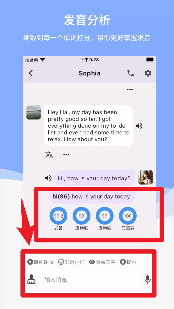 3. 在对话界面中点击下方语音按钮进行语音输入,系统会根据发音逐词评分,帮助你掌握语音细节与流利度。
