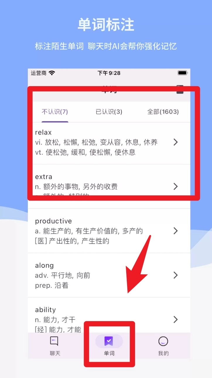 5. 切换至“单词”标签页,系统会自动标注你在聊天中遇到的生词,并进行分类整理,支持点击查看词义与用法。