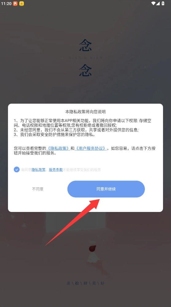 1、打开软件勾选同意隐私政策和用户服务协议,点击同意并继续。