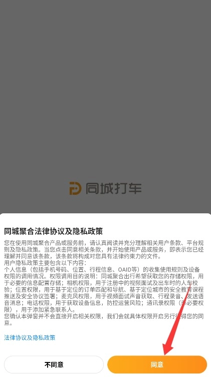 1. 首次使用同城聚合APP之际,请认真研读平台服务协议以及隐私保护政策,在确认无任何问题后,点击同意按钮以继续进行注册流程。