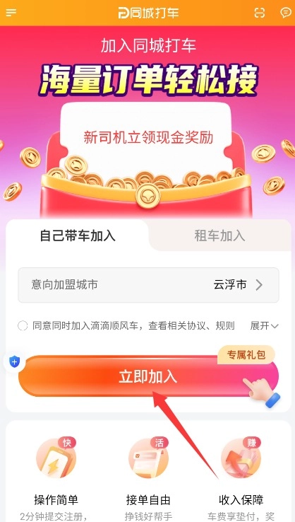 3、根据自身情况选择带车加入或租车加入模式,选定所在城市后点击确认按钮正式成为平台用户。
