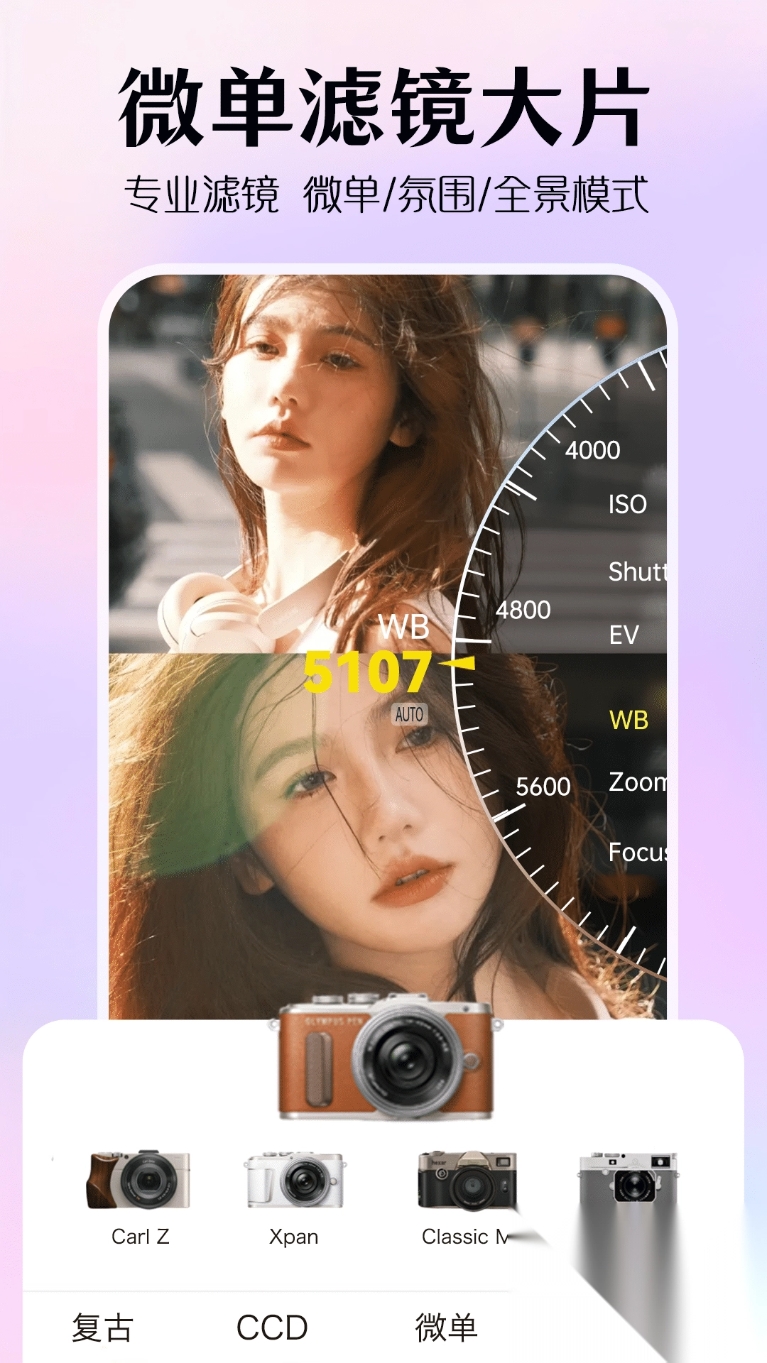 2、大家都觉得单反的拍摄效果更胜一筹,其实不然,软件里自带的微单滤镜,能让你瞬间拍出大片感。而且,各种类型的单反效果都能通过滤镜选择,直接让你的手机拍出微单级别的照片!