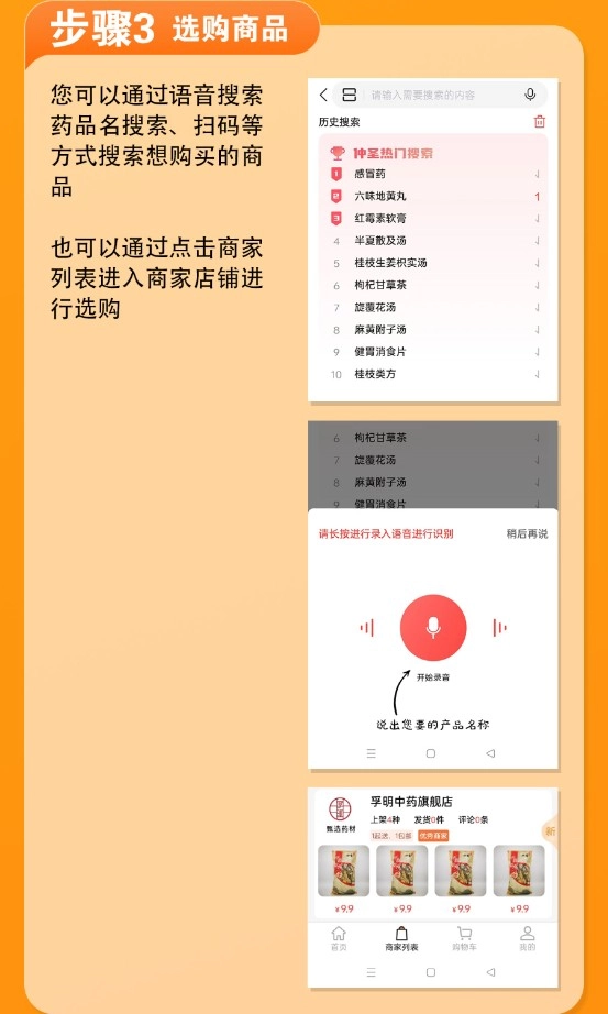 3、选购商品:支持语音、扫码搜索或进入店铺浏览商品选购。
