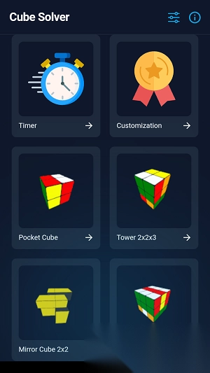 1. 在本站完成Cube Solver的下载与安装后,打开软件,进入主界面。其中,【Timer】是魔方计时器,【Customization】用于改变魔方样式,在界面下方,你能够挑选想要获取还原方法的魔方类型。