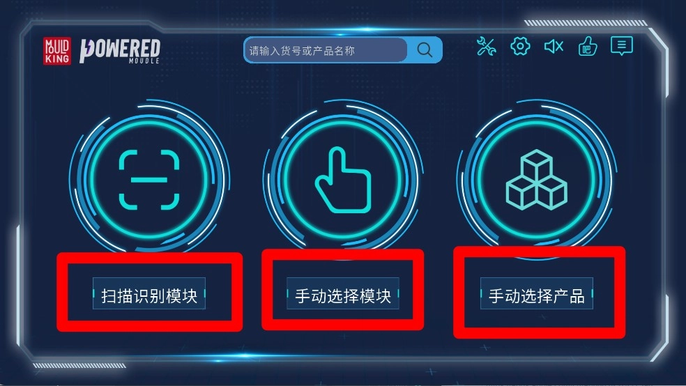 1、首页提供三种模式选择,可点击扫描、模块选择或产品选择进入。