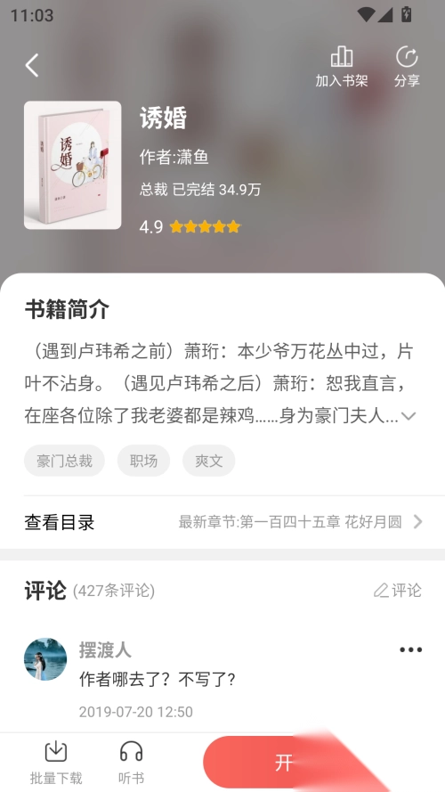 4、点击小说进入阅读页面,开始阅读。软件拥有评论区功能,在这里大家与其他读者小伙伴们一起交流小说,看有趣的评论。