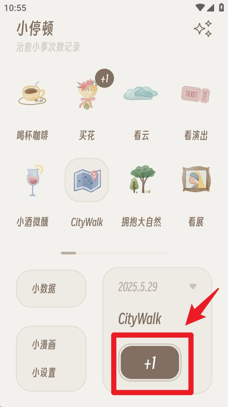 2. 点击选定小事下方的「+1」按钮,就能为该行为记录一次打卡数据。