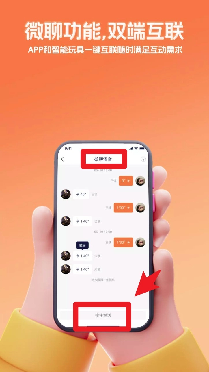 3. 进入「微聊语音」页面,在页面底部长按“按住说话”,就能录制并发送语音,实现与绑定设备或用户的实时语音互动。