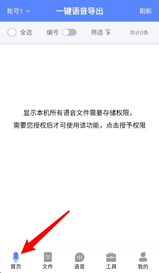 1. 点击首页图标,就能展示本机的语音文件清单。首次使用时,需要授予存储权限。