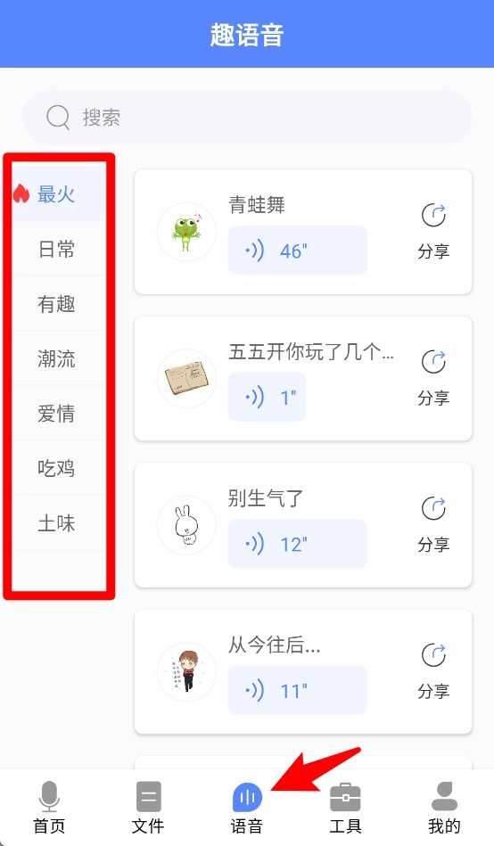 3、在“语音”页面可浏览热门趣味语音,分类清晰支持点击播放与分享。
