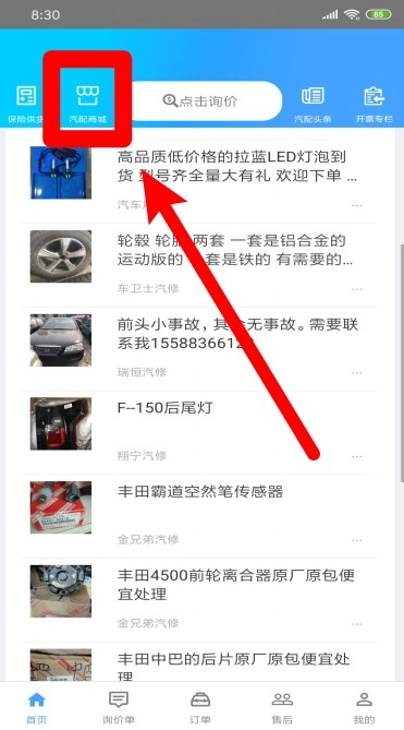 3.点击“汽配商城”可以进入商城,浏览购买汽车零配件产品。
