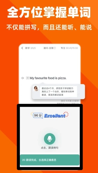 2、通过听说读写全面掌握单词记忆,系统会实时评分发音表现,有效提升孩子英语表达能力。
