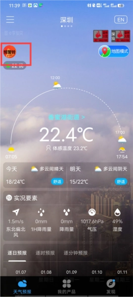 1、进入软件首页,我们可以看到详细天气信息,点击左上角的预警铃;